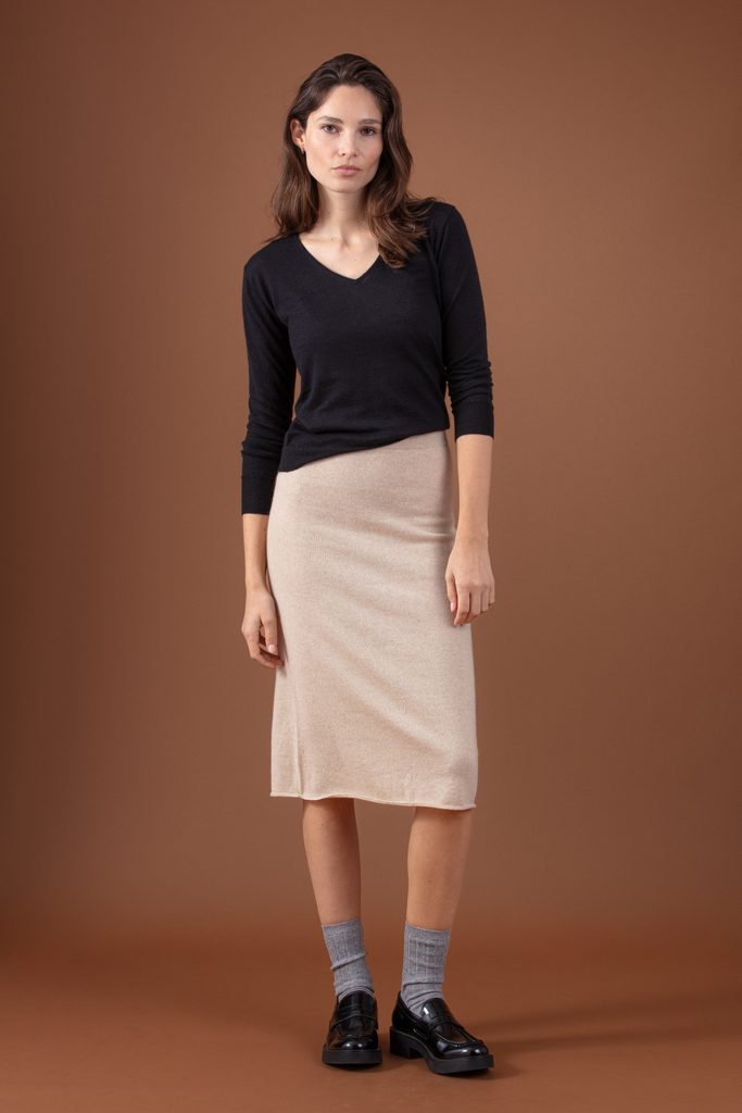 Combining feminine and comfort the REGINA skirt is knitted fine, fluid and luxurious 100% cashmere.