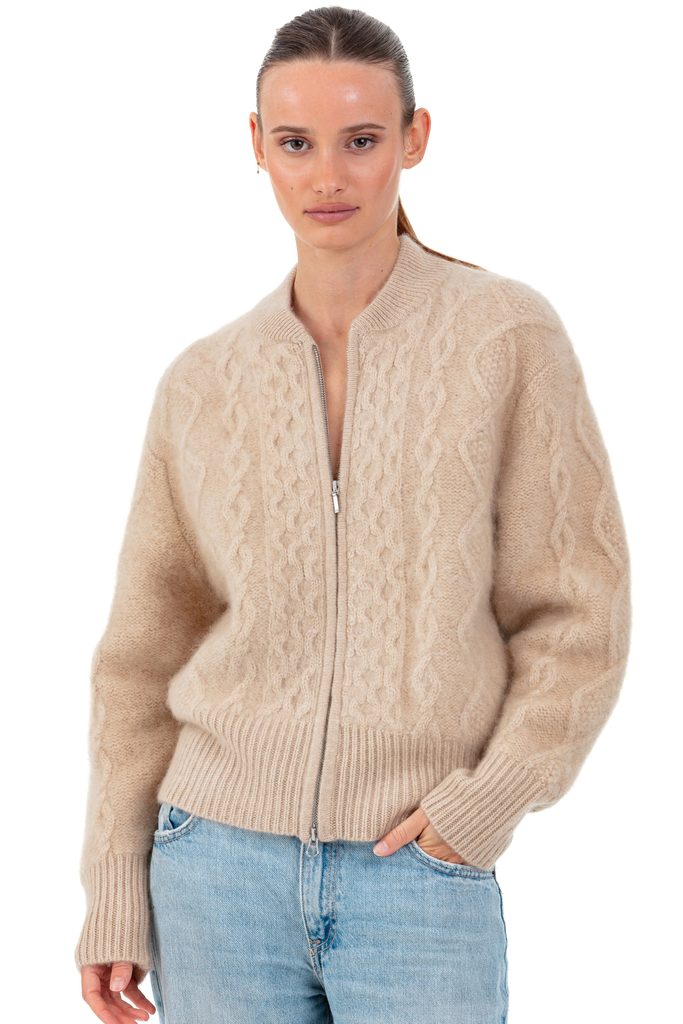 Original and trendy, the PARADIS women’s cardigan in brushed cashmere reinvents the bomber style in a luxurious and cosy version. Knitted in 100% 10-ply cocoon brushed cashmere, it is distinguished by its all-over cable pattern, wide cut, and round neck with tightened ribbed finishes. A zip fastening adds a modern, practical touch.